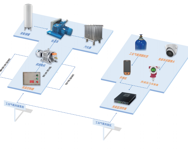 在原气瓶充装追溯系统基础上,对充装区域加装视频采集AI摄像头,通过充装智能分析模型自动识别扫码过程、气瓶数量、颜色等充装场景作业信息;在充装管路加装充装压力采集装置,实时采集充装管路压力数值,实现充装过程动态监测;储罐低温泵端加装控制中继器,对低温泵进行采集与管控,通过以上关键信息采集,形成工业气瓶自动充装视频Al管理过程分析,实现工业气瓶充装过程智能化、标准化、透明化管理,异常情况自动判断并上传,威慑并管控了工业气瓶作业过程,实现由人防到技防监管模式转变,提高工业气瓶充装追溯系统应用质量。